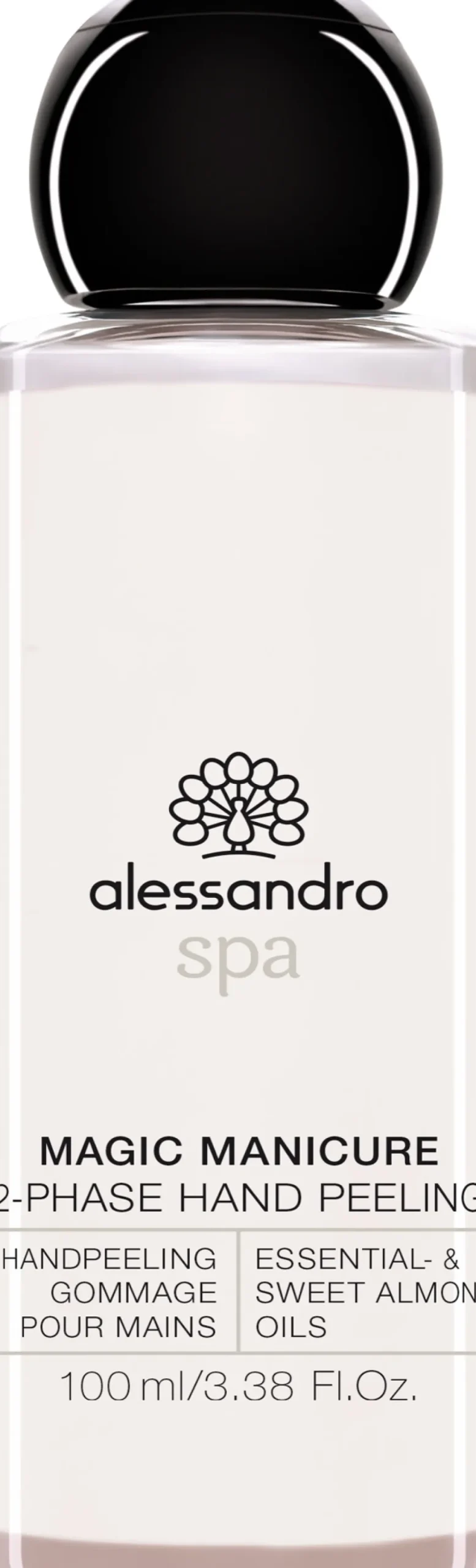 Der Flakon des Alessandro Spa Magic Manicure 2-Phase Handpeelings besticht durch seine schlichte Eleganz und klare Linienführung. Der transparente Körper des Produkts lässt die faszinierende Zweiphasenstruktur sichtbar werden, was nicht nur praktisch, sondern auch ein optisches Highlight ist. Der abgerundete schwarze Verschluss kontrastiert edel mit dem minimalistischen Etikett, das die wesentlichen Produktinformationen stilvoll präsentiert. Ein durchdachtes Design, das Funktionalität und ansprechende Ästhetik harmonisch verbindet.