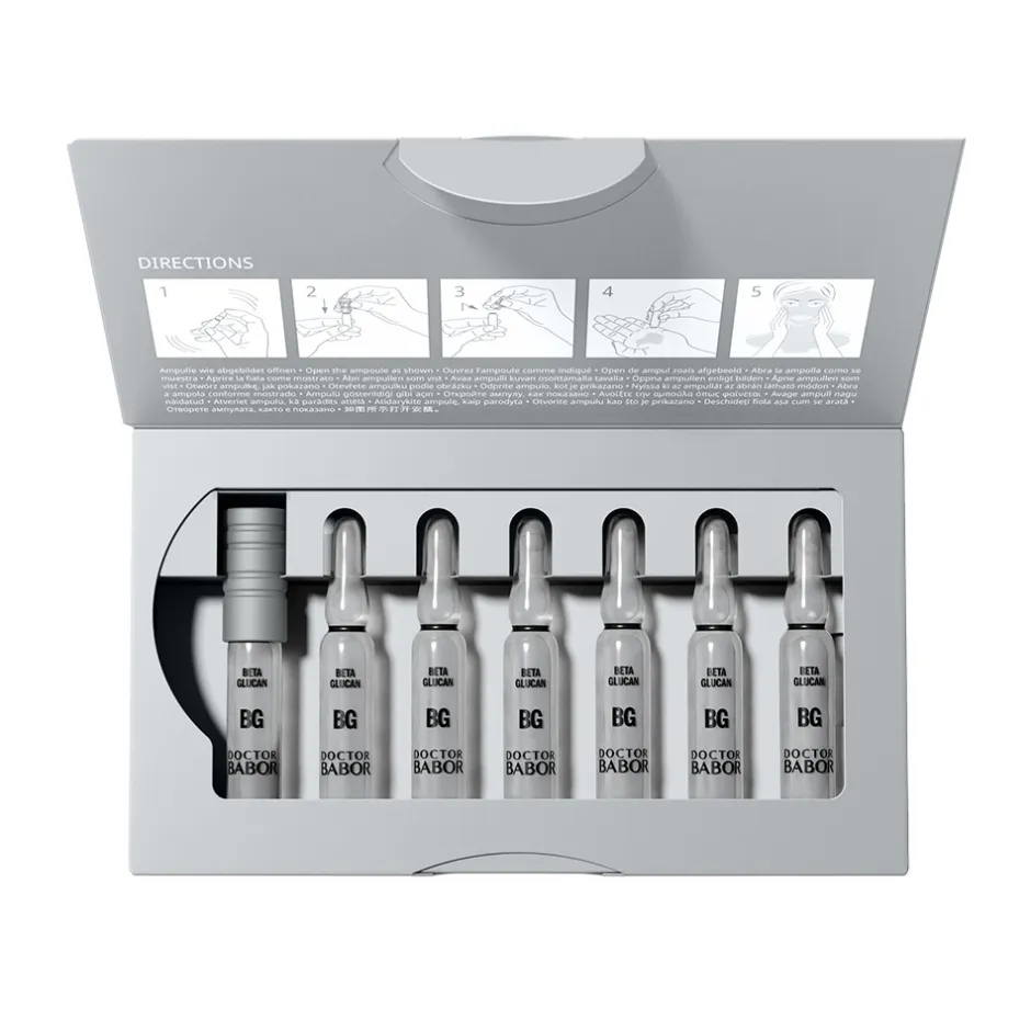 Das Set besteht aus sieben elegant gestalteten Ampullen, die in einer stilvollen, grauen Box präsentiert werden. Jede dieser Ampullen ist aus klarem Glas gefertigt, was den hochwertigen Inhalt optisch unterstreicht. Die klare und präzise Form der Ampullen spiegelt die Reinheit und Wirksamkeit des Produkts wider. Sie sind aufrecht in der Packung arrangiert, was für eine ansprechende und ordentliche Präsentation sorgt. Der silberne Verschluss verleiht dem Design einen modernen Akzent, während die schlichte Beschriftung der Ampullen das Gesamtbild elegant abrundet. Diese durchdachte Gestaltung macht die Anwendung zu einem ästhetischen Erlebnis, das Ihren Pflegealltag mit einem Hauch von Luxus bereichert.