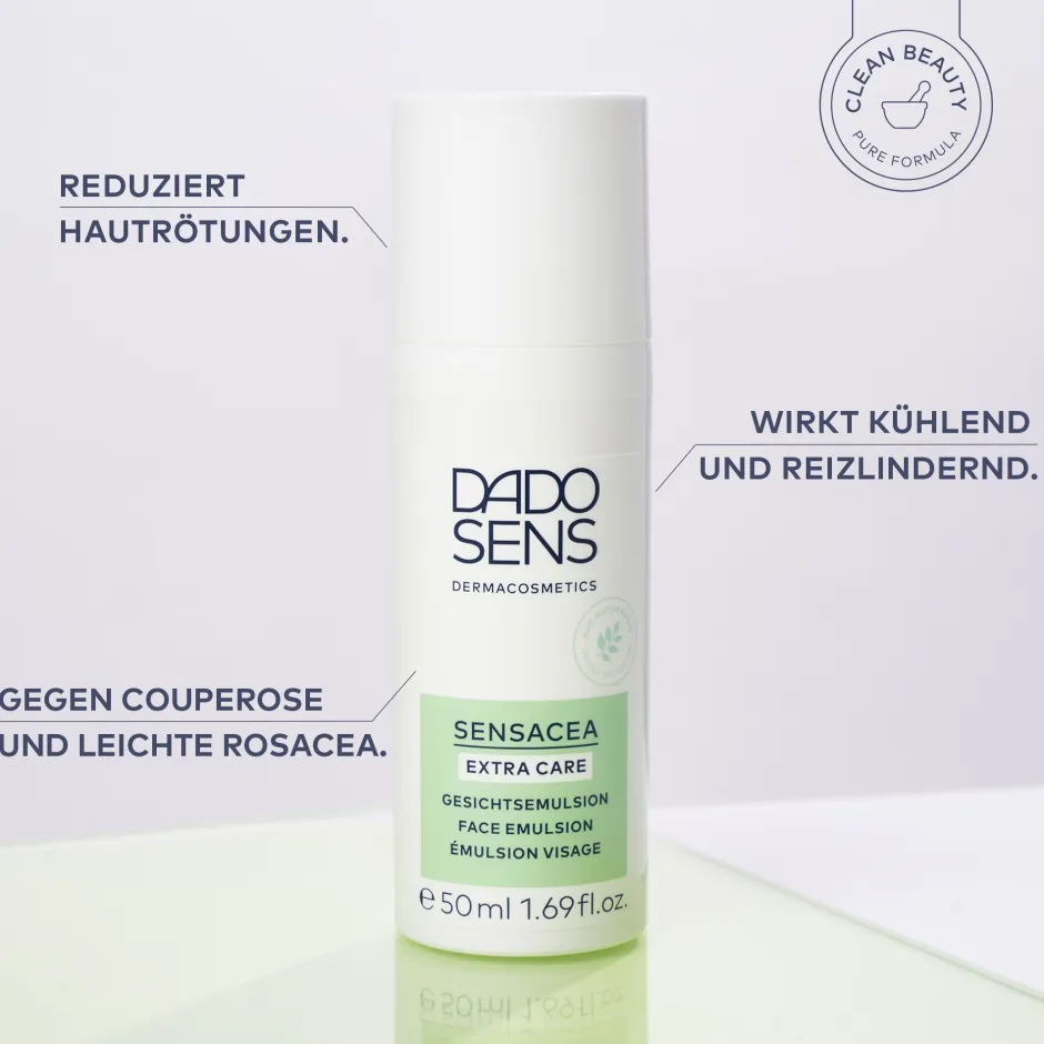 Die DADO SENS EXTRA CARE Gesichtsemulsion ist die ideale Lösung für hypersensible Haut, die zu Couperose und Rosacea neigt. Dank der Kombination wertvoller Inhaltsstoffe wie Allantoin und Panthenol wird Ihre Haut intensiv beruhigt und mit Feuchtigkeit versorgt. Allantoin wirkt entzündungshemmend und beruhigt gereizte Haut zuverlässig, während Panthenol die Zellerneuerung stimuliert und die Hautfeuchte sowie Elastizität verbessert. Der hochwirksame Komplex aus Süßholz, Aloe Vera und Purpur-Rotalge sorgt bei regelmäßiger Anwendung für eine nachhaltige Besänftigung der Haut, und Scharbockskraut-Extrakt mildert effektiv leichte bis mittlere Rötungen. Genießen Sie ein langanhaltend gepflegtes Hautgefühl und eine sichtbare Reduktion von Rötungen.