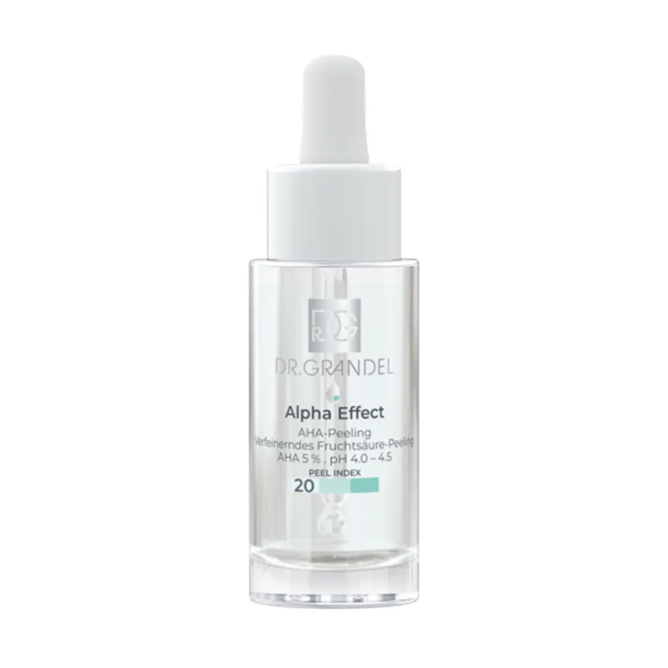 Der Flakon des DR. GRANDEL Alpha Effect AHA-Peeling Peel Index 20 besticht durch seine klare, elegante Gestaltung. Die transparente Glasflasche lässt die subtile Färbung der gelartigen Textur erkennen und vermittelt einen Hauch von Reinheit und Frische. Der praktische Pipettenverschluss ermöglicht eine präzise Dosierung, während das minimalistische Etikett die Produktinformationen stilvoll hervorhebt. Dieses durchdachte Design spiegelt die hochwertige Qualität des Peelings wider und macht es zu einem ansprechenden Element in Ihrem Kosmetiksortiment.