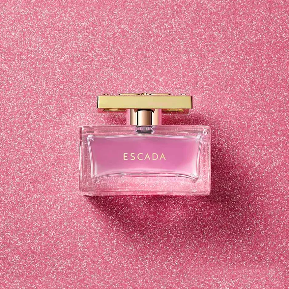 Der Flakon des Escada Eau de Parfum Nat. Spray präsentiert sich in einem zeitlosen Design, das Eleganz und moderne Raffinesse vereint. Der klare, rechteckige Glasflakon gibt den Blick auf die zarte, roséfarbene Flüssigkeit frei, die im Inneren funkelt. Der goldene Verschluss setzt einen edlen Akzent, der die luxuriöse Ausstrahlung des Duftes unterstreicht. Diese harmonische Gestaltung spiegelt die femininen und glamourösen Eigenschaften des Parfums wider und macht es zu einem stilvollen Begleiter für jede Gelegenheit.