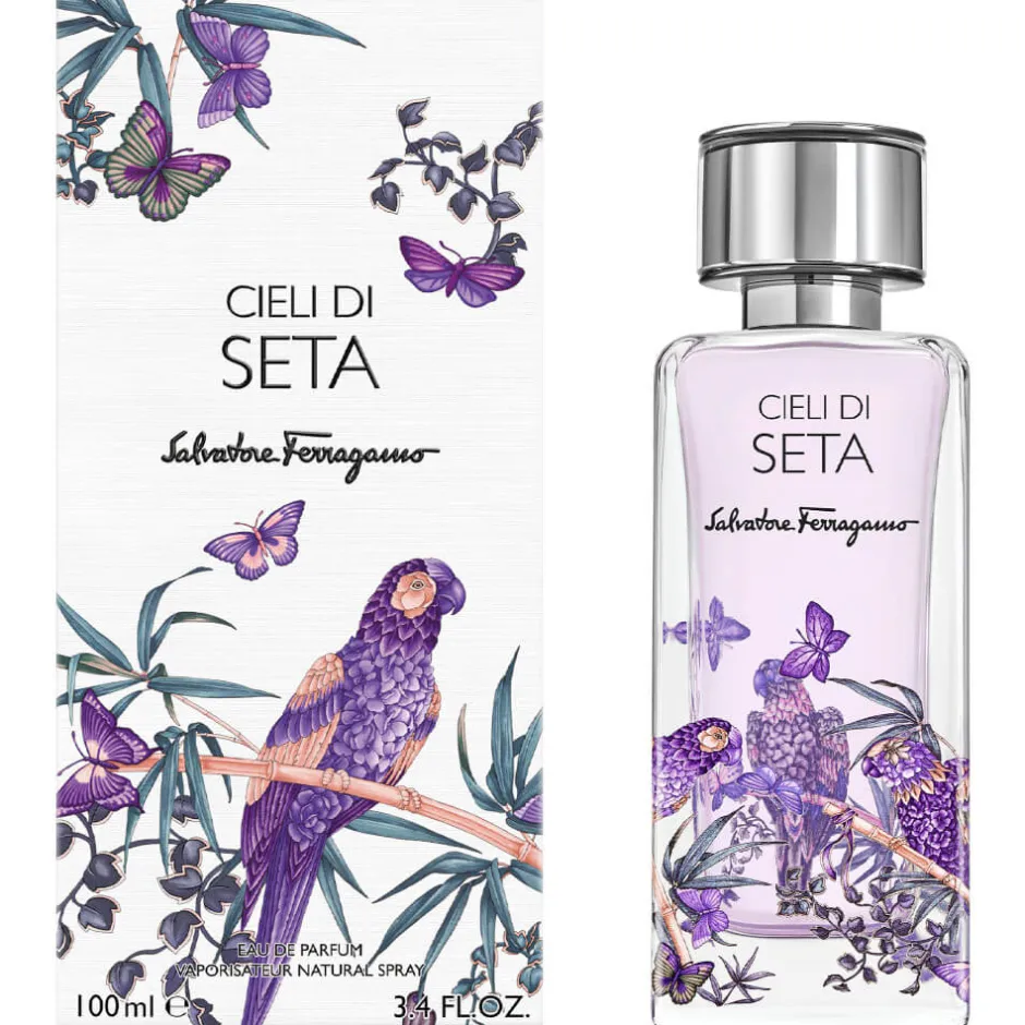 Ferragamo Cieli di Seta präsentiert sich in einem kunstvoll gestalteten Flakon, der die Essenz des Duftes perfekt widerspiegelt. Der klare Glasflakon wird von exquisiten, floralen Illustrationen in zarten Lila- und Violetttönen geschmückt, die an eine blühende Landschaft erinnern. Dieser detailreiche Entwurf umhüllt das Parfum mit einem Hauch von Natur und Anmut. Der elegante, silberne Verschluss rundet das Design stilvoll ab und macht den Flakon zu einem wahren Schmuckstück in jeder Sammlung. Lassen Sie sich von der optischen und olfaktorischen Schönheit dieses exklusiven Duftes verzaubern.