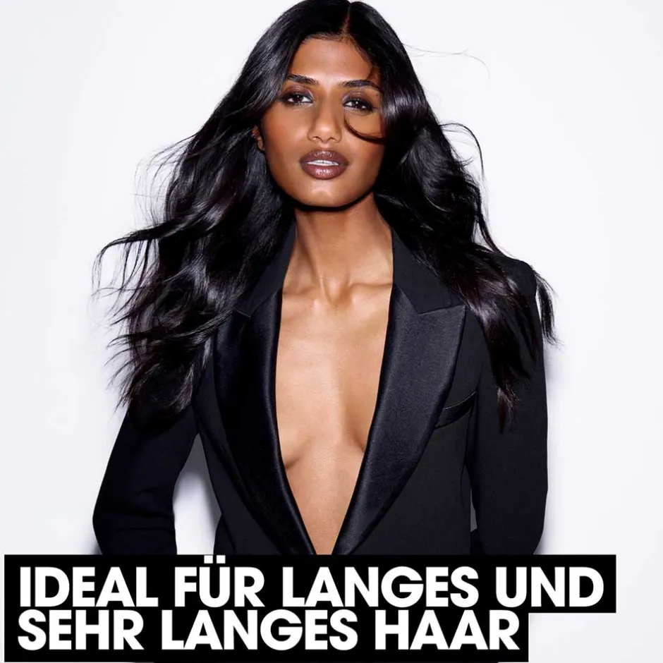 1Im Vergleich zu einem Lockenstab eines Mitbewerbers mit 190 °C. Labortest, bei dem die Zeit gemessen wird, die benötigt wird, um die gleiche Lockenlänge zu formen (ohne max wand). 180-190 °C für classic tong, 190 °C für grand tong und conical wand. Labortest, bei dem die Zeit gemessen wurde, um die gleiche Lockenlänge zu erzielen.