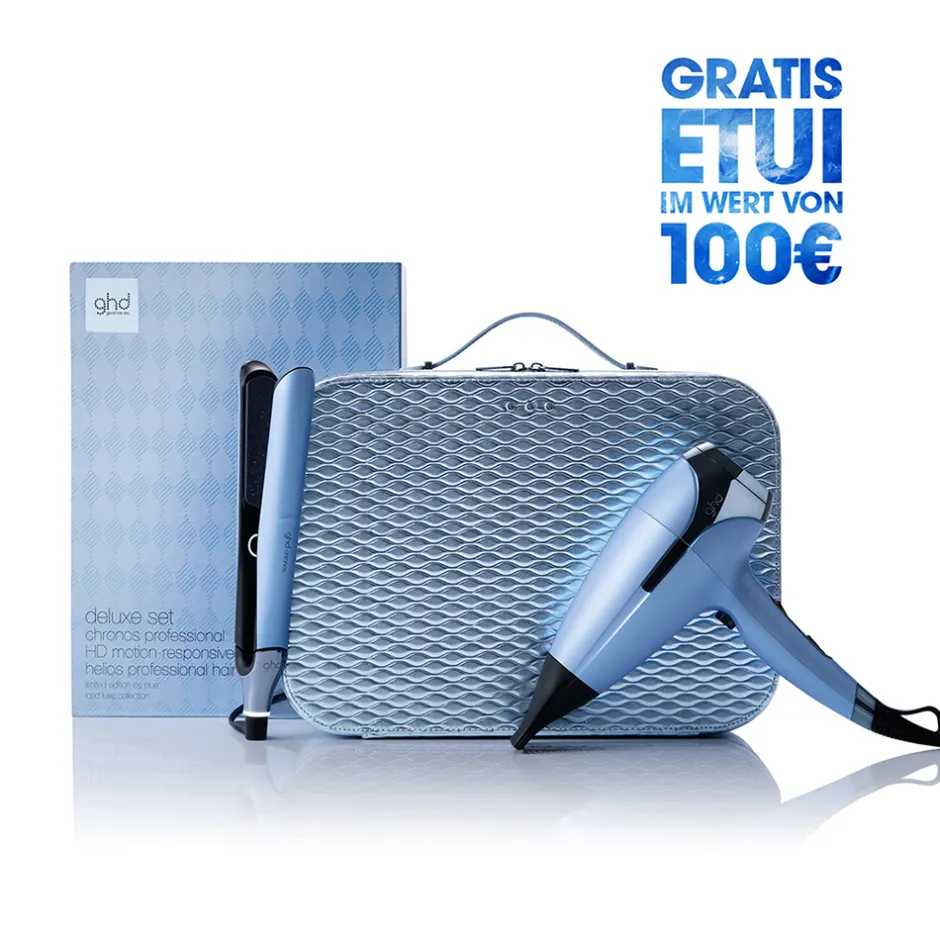 Erleben Sie das ghd – good hair day Iced Luxe Deluxe Set, das Ihnen endlose Good Hair Days beschert. Der ghd chronos™ Glätteisen-Styler beeindruckt mit seiner innovativen HD Motion-Responsive™ Technologie, die dynamisch auf Ihre Stylingbewegungen reagiert. Die Platten sind mit Ultra-Gloss beschichtet, was bis zu 85% mehr Glanz ermöglicht und das Haar frizz-frei aussehen lässt. Das Gerät bietet eine kontinuierliche Wärmeverteilung bei 185°C, um Ihr Haar optimal zu schützen und das Styling in kürzester Zeit abzuschließen. Der ghd helios® Haartrockner ergänzt das Set mit seiner Aeroprecis™ Technologie, die für einen fokussierten Luftstrom sorgt. Mit variablen Einstellungen und einer Kaltlufttaste haben Sie die volle Kontrolle über Ihr Styling. Das Set wird durch ein Etui im Wert von 100 Euro abgerundet, das Ihre Werkzeuge sicher aufbewahrt.