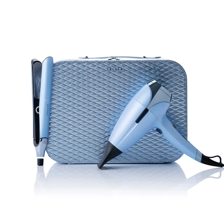 Das ghd – good hair day Iced Luxe Deluxe Set erstrahlt in einem bezaubernden eisig-glitzernden Blau, das jedem Frisiertisch eine elegante Note verleiht. Der schlanke und ergonomische Aufbau des Glätteisens ermöglicht sowohl das Kreieren glatter Frisuren als auch von Locken und Wellen. Die beweglichen Keramikplatten sind perfekt ausgerichtet und bieten Ihnen die Freiheit, kreativ zu sein. Der Haartrockner glänzt nicht nur durch seine Leistung, sondern auch durch das durchdachte Design mit einem aerodynamischen Gehäuse und einer speziell entwickelten Zentrierdüse. Beide Geräte vereinen Funktionalität und Ästhetik, während das luxuriöse Etui das Set harmonisch abrundet und für eine stilvolle Aufbewahrung sorgt.