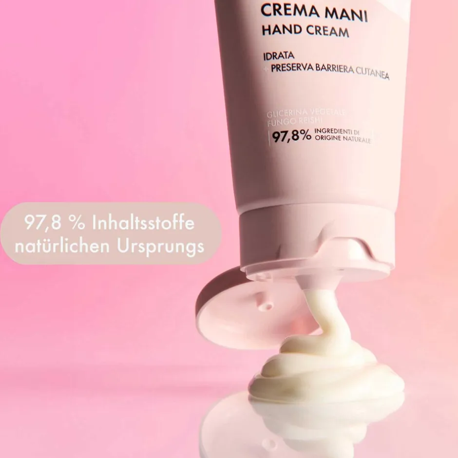 Die Save My Hands Handcreme bildet einen Schutzfilm, der die Hautbarriere vor Umwelteinflüssen bewahrt. Die Formel ist mit pflanzlichem Glyzerin, glänzendem Lackporling (Reishi-Pilz) mit seinen bekannten antioxidativen Eigenschaften und Mandelöl angereichert, um die Haut sofort und intensiv zu nähren. Die reichhaltige, sensorische und umhüllende Textur zieht leicht ein, ohne zu kleben, und sorgt den ganzen Tag lang für weiche, samtige Hände und ein angenehmes Gefühl. Klinisch-instrumentelle Tests ergaben*: +68,8 % Feuchtigkeitsgehalt nach 30 Minuten