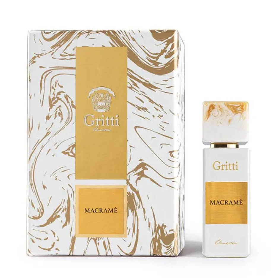 Der Flakon des Gritti Macramè Eau de Parfum Nat. Spray besticht durch seine klare, elegante Form. In edlem Weiß gehalten, wird das Design von einem goldenen Etikett ergänzt, das dezente Eleganz vermittelt. Der Verschluss, verziert mit einem marmorierten Muster in warmen Erdtönen, unterstreicht die luxuriöse Ausstrahlung. Diese Verbindung aus Purismus und Raffinesse spiegelt die erlesene Duftkomposition wider und macht den Flakon zu einem wahren Schmuckstück. Ein Produkt, das nicht nur durch seinen Duft, sondern auch durch seine ästhetische Erscheinung überzeugt.