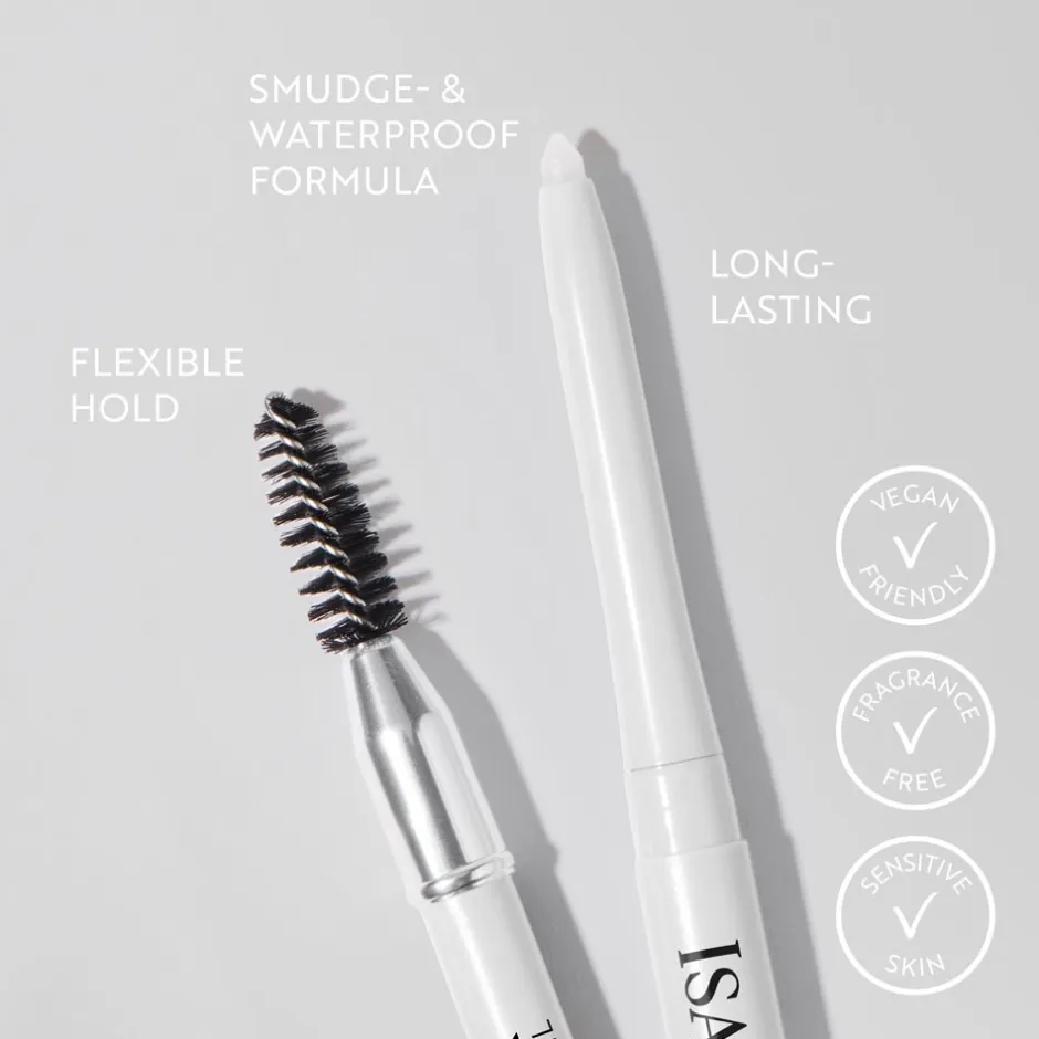 Der IsaDora Brow Fix Wax-In-Pencil besticht durch sein minimalistisches, zeitloses Design. Der schlanke, weiße Stift liegt angenehm in der Hand und ermöglicht präzise Bewegungen. Dank der transparenten Verschlusskappen ist die Spoolie-Bürste stets geschützt, und das klare Design unterstreicht die Funktionalität des Produkts. Die Schlichtheit harmoniert mit jeder Kosmetikausrüstung und sorgt für einen aufgeräumten Look. Seine mechanische Drehfunktion erlaubt ein einfaches Nachführen des Wachses, sodass das Produkt immer einsatzbereit ist.