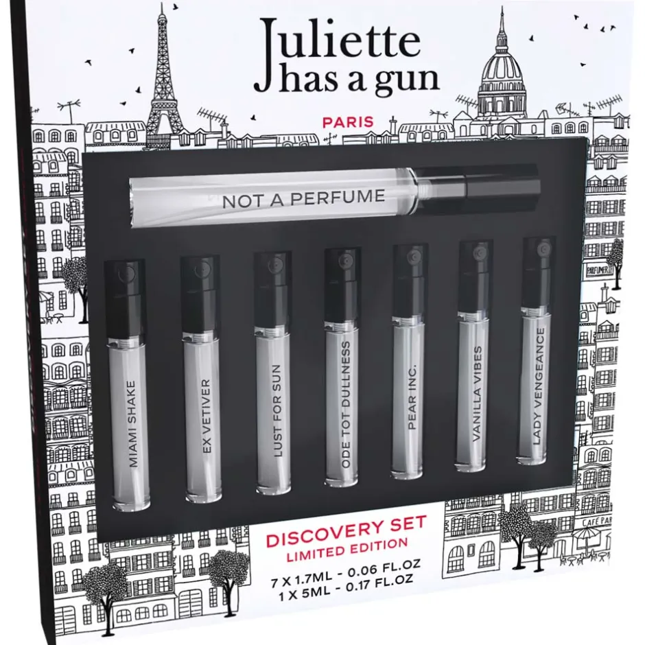 Erleben Sie das exquisite Juliette has a Gun Discovery Set, das in einer limitierten Auflage erhältlich ist. Dieses sorgfältig zusammengestellte Set bietet Ihnen die Möglichkeit, unsere faszinierenden Duftkreationen in einer stilvollen Kollektion zu genießen. Im Mittelpunkt steht das ikonische Not a Perfume, das mit seiner klaren, eleganten Note begeistert. Ergänzend dazu finden Sie sechs weitere charaktervolle Düfte: Vanilla Vibes verführt mit einer warmen Vanille-Note, während Lady Vengeance eine sinnliche, geheimnisvolle Aura schafft. Pear Inc. bietet einen fruchtigen, frischen Akzent, und Mmmm… verführt mit einem süßen, gourmandigen Charme. Lust for Sun bringt sommerliche Leichtigkeit, während Moscow Mule mit einem prickelnden, spritzigen Duft überrascht. Jeder Duft erzählt seine eigene, faszinierende Geschichte und bietet Ihnen ein unvergessliches olfaktorisches Erlebnis.