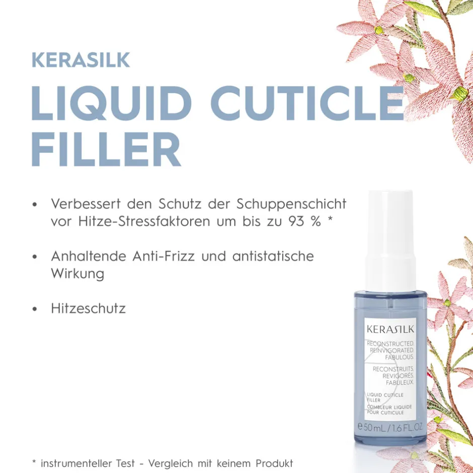 Das Kerasilk Travel Set besticht durch ein elegantes und dezentes Design, das die Hochwertigkeit der Pflegeprodukte unterstreicht. Jedes Fläschchen präsentiert sich in einem sanften, cremigen Farbton, der einen Hauch von Luxus ausstrahlt. Die klaren Linien und die schlanke Form der Behälter vermitteln einen modernen und gleichzeitig zeitlosen Eindruck. Der Liquid Cuticle Filler hebt sich durch seine elegante bläuliche Note hervor, die im Kontrast zur warmen Gesamtfarbgebung steht. Die Verpackung des Sets ist mit zarten, floralen Elementen verziert, die einen natürlichen und harmonischen Akzent setzen. Diese ästhetische Gestaltung macht das Set nicht nur zu einem Wohlfühlerlebnis für Ihr Haar, sondern auch zu einem optischen Genuss.