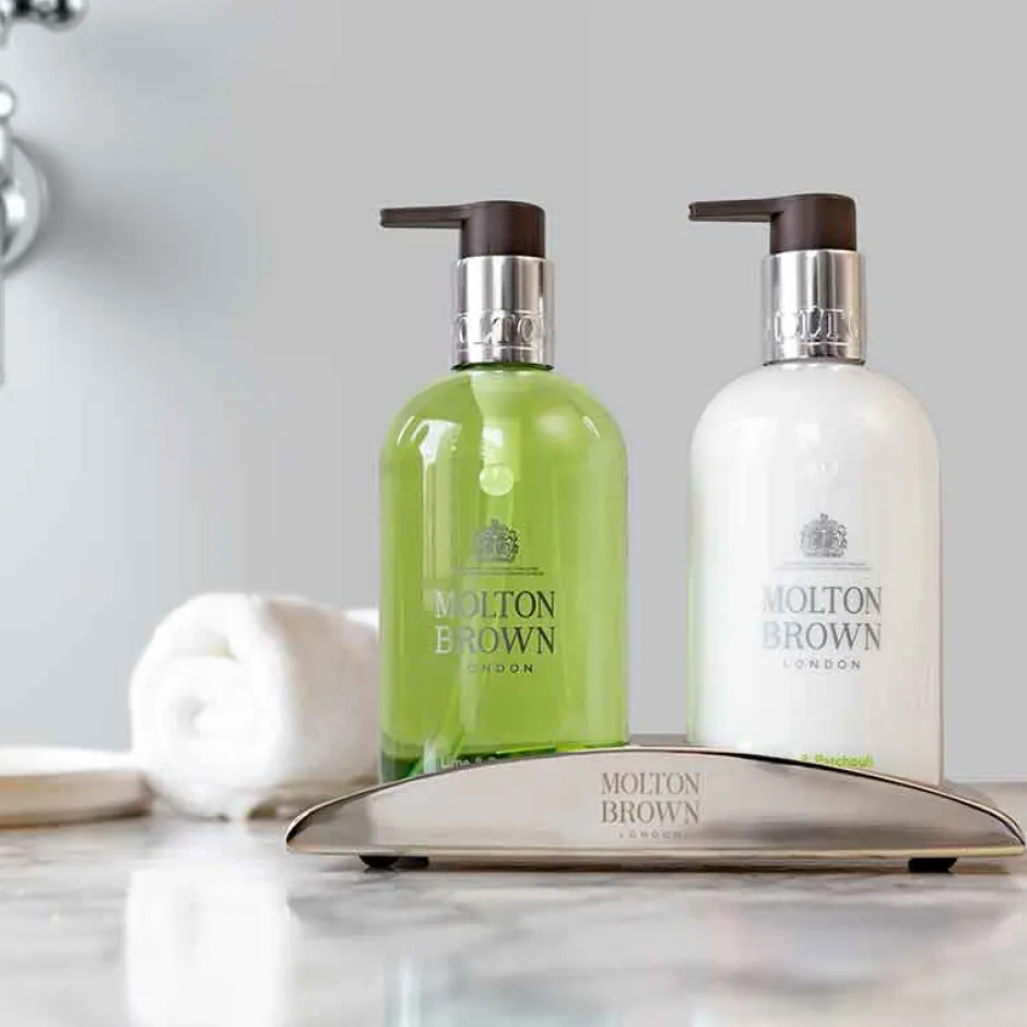 Der Flakon des Molton Brown Lime & Patchouli Fine Liquid Hand Wash ist ebenso ansprechend wie der Duft selbst. Die klare, grüne Flüssigkeit wird durch das minimalistische Design des Behälters hervorgehoben, welcher durch seine sanft geschwungene Form elegant in Ihrer Küche oder Ihrem Bad zur Geltung kommt. Der silberne Pumpspender verleiht dem Produkt einen modernen Touch und sorgt für eine einfache Handhabung. Die subtile Gestaltung des Etiketts mit der charakteristischen Molton Brown Beschriftung rundet das edle Gesamtbild ab und macht es zu einem stilvollen Accessoire, das sich harmonisch in jedes Ambiente einfügt.