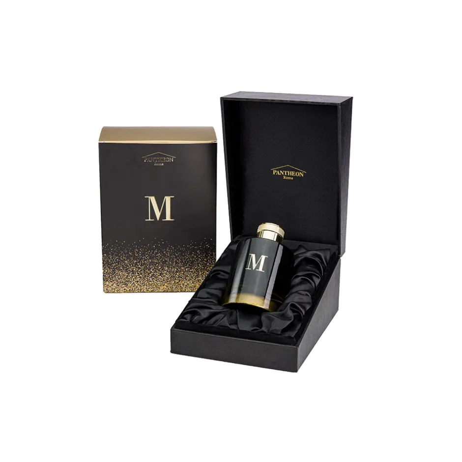 Der Flakon des Pantheon Roma Extrait de Parfum ist ein Zeugnis von schlichter Eleganz und zeitloser Schönheit. Der tiefschwarze Glasflakon, durchzogen von einem sanften Schimmer, steht für die geheimnisvolle Tiefe des Dufts. Gekrönt wird er von einem goldenen Verschluss, der einen Hauch von Luxus verleiht und die raffinierte Gestaltung abrundet. Die Form ist klar und modern, dennoch klassisch und stilvoll, was den charakteristischen Buchstaben M auf der Vorderseite perfekt ergänzt. Diese sorgfältige Gestaltung betont die harmonische Verbindung von Kunst und Duft, die in diesem Parfum ihren Ausdruck findet.