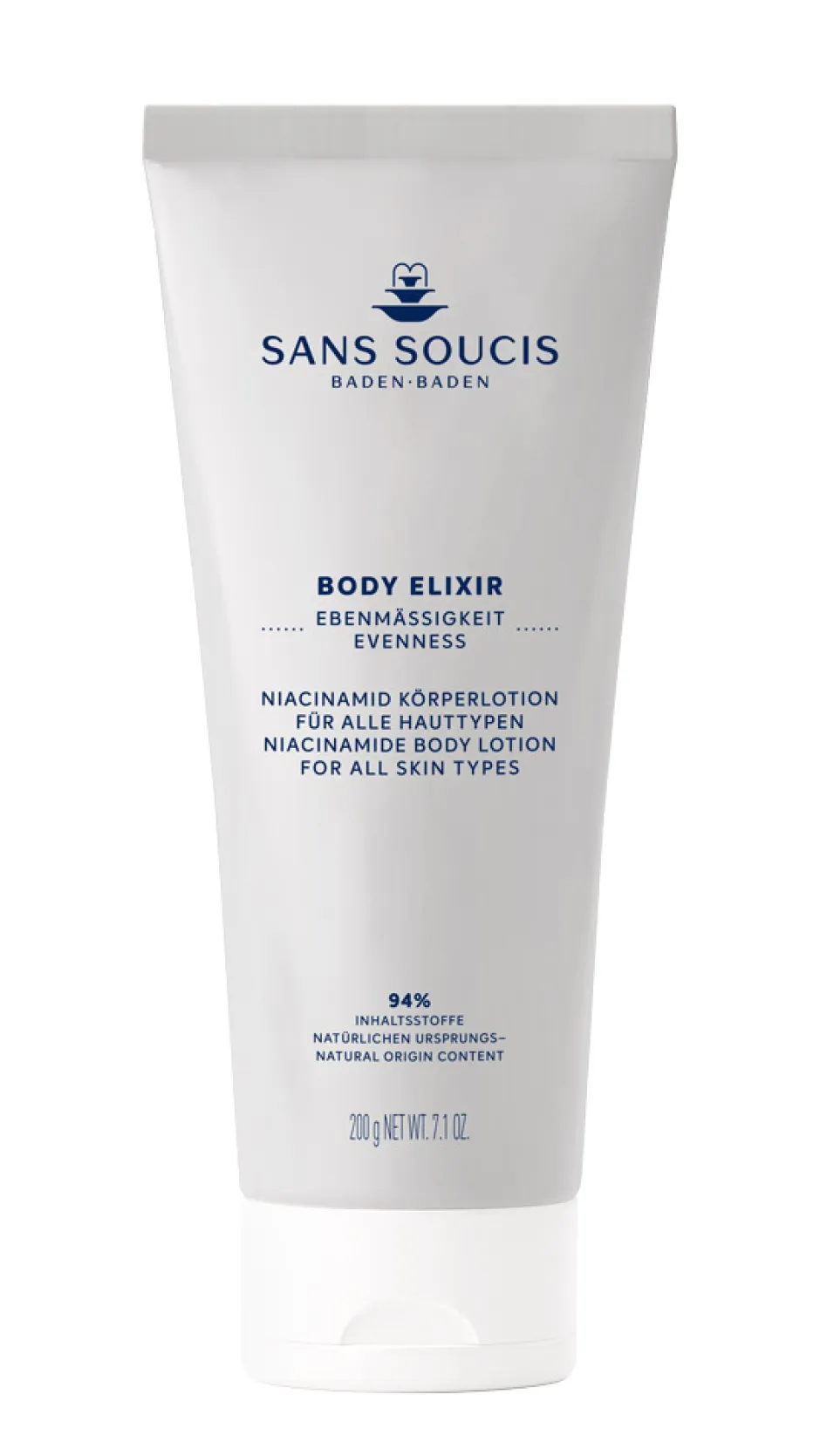 Die Sans Soucis Niacinamid Körperlotion verleiht Ihrer Haut eine außergewöhnliche Geschmeidigkeit und sorgt für ein ebenmäßiges Hautbild. Dank der hochwertigen Kombination aus Niacinamid und dem berühmten Thermalwasser aus Baden-Baden werden Hautunregelmäßigkeiten spürbar gemildert. Die spezielle Formulierung wirkt der Entstehung von Pigmentflecken gezielt entgegen und bringt Ihre Haut zum Strahlen. Mit der wohltuenden Wirkung von Panthenol wird die Haut beruhigt, leichte Rötungen klingen ab und ein harmonisches Gleichgewicht wird wiederhergestellt. Die tägliche Anwendung dieser feinen Lotion unterstützt Sie darin, ein verfeinertes und ausgeglichenes Hautbild zu erreichen. Denken Sie daran, Ihre Haut tagsüber vor der Sonne zu schützen, um die Wirkung optimal zu unterstützen.
