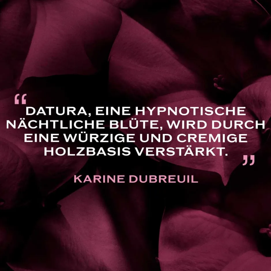 Der Flakon des Shiseido Datura Eau de Parfum ist ein Kunstwerk, das die Essenz des Duftes in seiner Gestaltung einfängt. Entworfen von Designerin Constance Guisset, symbolisiert der schwarze, in den Flakon integrierte Akzent ein Messer, das in das Herz des Duftes gestoßen ist und die innere Stärke jeder Frau verkörpert. Die schlichte, aber ausdrucksstarke Form des Flakons wird durch die Verwendung von 15 % recyceltem Glas unterstrichen. Die Verpackung, aus nachhaltig bewirtschaftetem FSC-Karton gefertigt, reflektiert das Engagement für Umweltbewusstsein und Ästhetik in perfekter Harmonie.