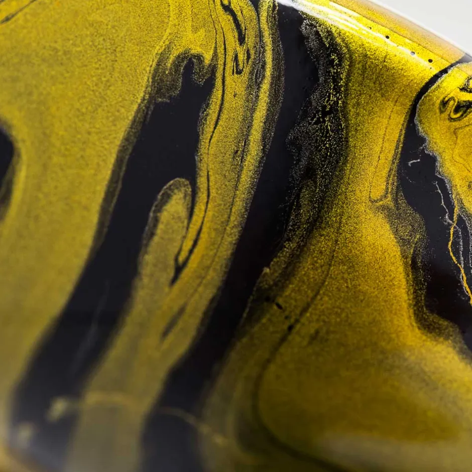 Der Flakon von The House of Oud Eau de Parfum ist ein wahres Meisterwerk der Gestaltung. Seine Form erinnert an ein kunstvoll geschliffenes Objekt, das sowohl robust als auch raffiniert wirkt. Die Oberfläche präsentiert sich in einem tiefen Schwarz, das von dynamischen goldenen Wirbeln durchzogen ist. Diese elegante Kombination aus Farbe und Form verleiht dem Flakon ein luxuriöses und zugleich geheimnisvolles Aussehen. Der Sockel des Flakons ist mit feinen, filigranen Details versehen, die seine erhabene Erscheinung unterstreichen. Ein wahres Schmuckstück, das jeden Raum mit seiner Präsenz bereichert.