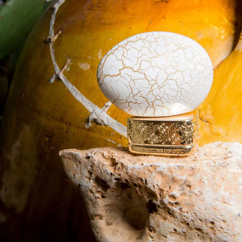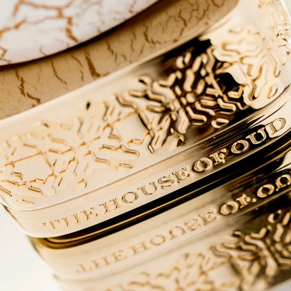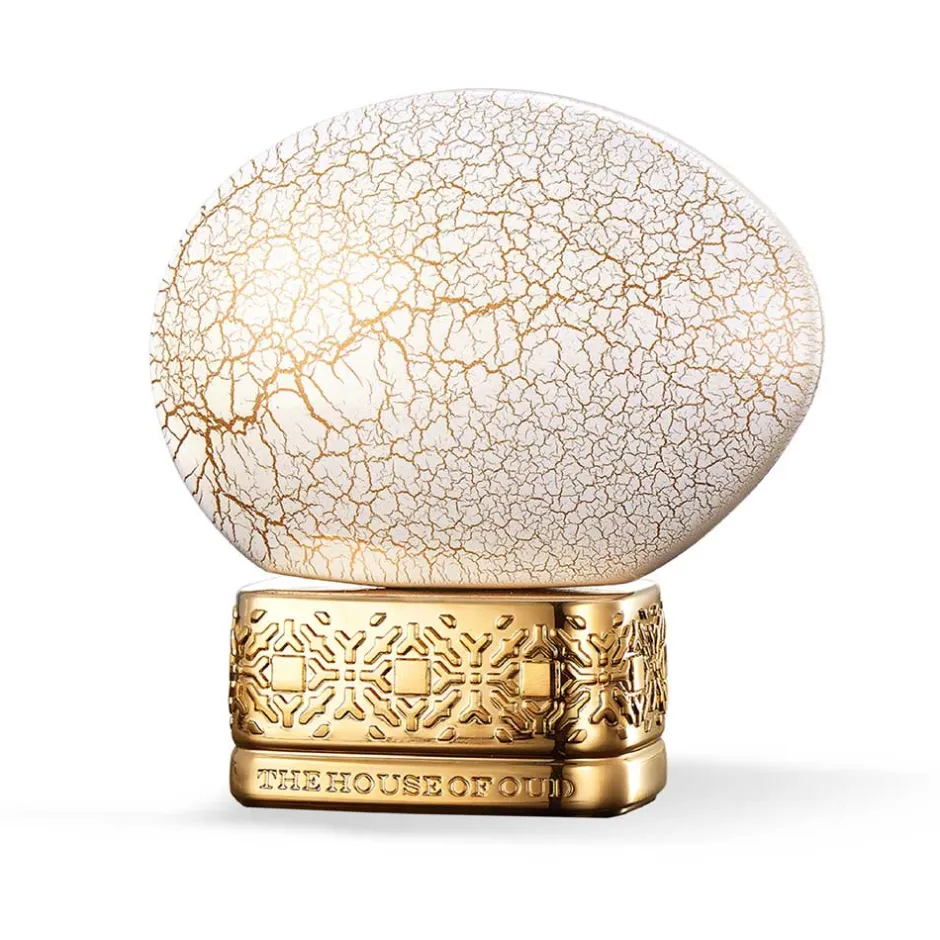 Der kunstvolle Flakon von The House of Oud Eau de Parfum zieht mit seiner außergewöhnlichen Form alle Blicke auf sich. Die ovale Struktur erinnert an kostbare Edelsteine und ist mit einem feinen Netz aus goldenen Adern durchzogen, das die Eleganz und Exklusivität dieses Duftes unterstreicht. Der Sockel, reich verziert und in goldener Pracht gehalten, trägt den Namen des Hauses und verleiht dem Flakon eine majestätische Aura. Diese visuelle Anmutung spiegelt die tiefgründige und inspirierende Duftreise wider und macht ihn zu einem wahren Sammlerstück.