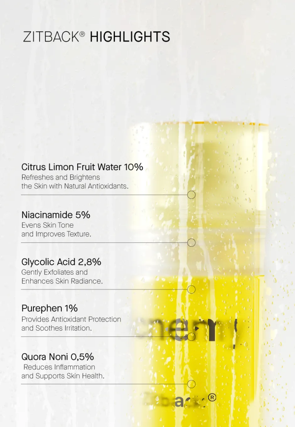 Das Acnemy Zitback Körperspray wurde speziell für die Bedürfnisse von zu Akne neigender Haut entwickelt. Seine innovative, schnell trocknende Formel ist ölfrei und verhindert somit ein fettiges Hautgefühl. Die enthaltenen BHA- und AHA-Säuren wirken gezielt, um die Haut sanft zu peelen und überschüssiges Öl zu entfernen. Dabei wird die Bildung von Mitessern effektiv reduziert, ohne die Haut zu reizen. Das integrierte Zitronenwasser unterstützt diesen Prozess als natürliches Exfoliationsmittel. Diese sorgfältig ausgewählten Inhaltsstoffe arbeiten harmonisch zusammen und bieten eine ideale Lösung für die tägliche Pflege, die Ihre Haut klärt und erfrischt.