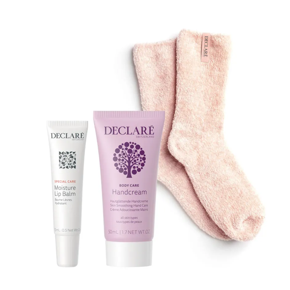 Das Declaré Set vereint sorgfältig ausgewählte Produkte, die speziell für die Bedürfnisse trockener Haut entwickelt wurden. Der Moisture Lip Balm spendet intensive Feuchtigkeit und verleiht den Lippen einen zarten Schimmer. Mit wertvollem Bienenwachs und pflegendem Kokosöl schützt der Balsam vor dem Austrocknen und sorgt für geschmeidige Lippen. Die Skin Smoothing Hand Care verwöhnt Ihre Hände mit Makadamia-Nuss-Öl und Coenzym Q10. Diese reichhaltige Creme glättet raue Haut und hinterlässt ein sanft gepflegtes Gefühl. Massieren Sie die Creme sanft ein, um die volle Wirkung zu entfalten, und genießen Sie den wohltuenden Effekt. Abgerundet wird das Set durch kuschelige Socken, die Ihre Füße warmhalten und das Wohlfühlerlebnis komplettieren.