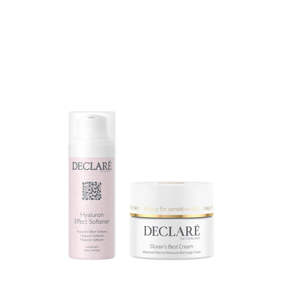 Das Declaré Ocean’s Best Vorteils-Set besticht durch sein elegantes Design. Die Hydro Balance Creme befindet sich in einem stilvollen, weißen Tiegel, der durch seine klare Form und die schlichte Beschriftung in Silber einen Hauch von Luxus vermittelt. Der Hyaluron Effect Softener präsentiert sich in einem schlanken Pumpflakon, der mit seiner transparenten Hülle und der dezenten Gestaltung pure Modernität ausstrahlt. Beide Artikel zusammen bilden ein harmonisches Ensemble, das nicht nur optisch ansprechend ist, sondern auch auf Ihrer Pflegestation ein echtes Highlight darstellt. Die Kombination aus Funktionalität und Ästhetik unterstreicht die hohe Qualität, die Sie von Declaré erwarten können.
