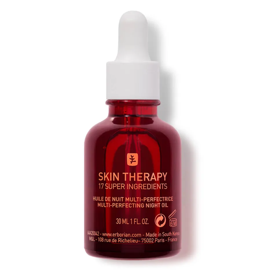 Mit dem Erborian Skin Therapy Multi-regenerierenden Zwei-Phasen-Nachtöl erwachen Sie jeden Morgen mit einer erfrischten und strahlenden Haut. Dank der einzigartigen Kombination aus 17 Pflanzenextrakten entfaltet dieses Öl seine volle Wirkung im Schlaf. Bereits nach der ersten Anwendung fühlt sich Ihre Haut glatter und intensiv genährt an. Die feuchtigkeitsspendende Kraft von Hyaluronsäure lässt Ihren Teint frisch und prall wirken, während Squalan die Haut nachhaltig nährt. Fältchen und feine Linien werden Tag für Tag sichtbar gemindert, wodurch Ihre Haut geschmeidiger und klarer erscheint. Die sanft peelende Wirkung von PHA unterstützt die Zellerneuerung, und Bisabolol beruhigt und entstresst die Haut. Zink PCA sorgt dafür, dass Hautunreinheiten reduziert werden, was zu einem ebenmäßigen Hautbild führt.