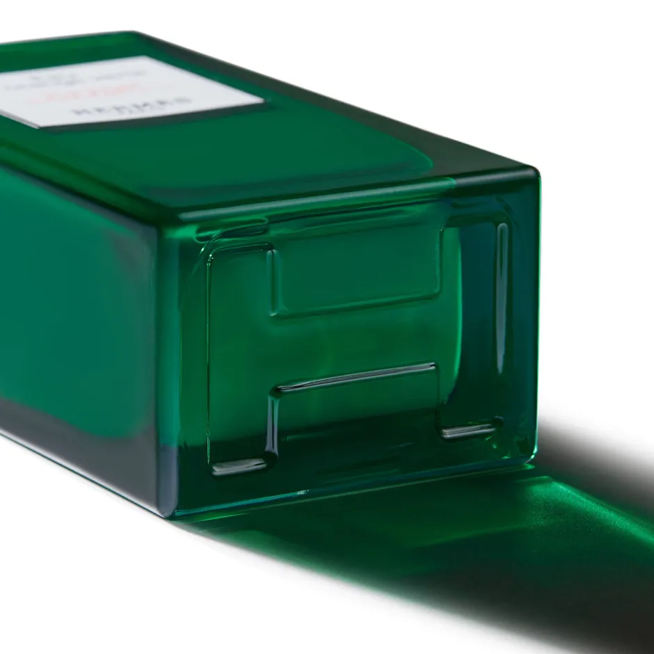 Der Flakon der HERMÈS Body Lotion ist ein Kunstwerk für sich. Mit klaren, geraden Linien und einem tiefen Grünton spiegelt er die Essenz von Eau d’orange verte wider. Zwei unverkennbare Hermès-Elemente zieren ihn: der H-förmige Boden symbolisiert die Marke, während der „Clou de Selle“-Sattlernagel detailverliebt den Pumpkopf schmückt. Gefertigt aus recycelbarem Glas, ist der Flakon nicht nur ein Blickfang, sondern auch Ausdruck von Nachhaltigkeit und Innovation. Diese elegante Gestalt passt perfekt in jeden Raum und verkörpert zeitlose Schönheit und Funktionalität.