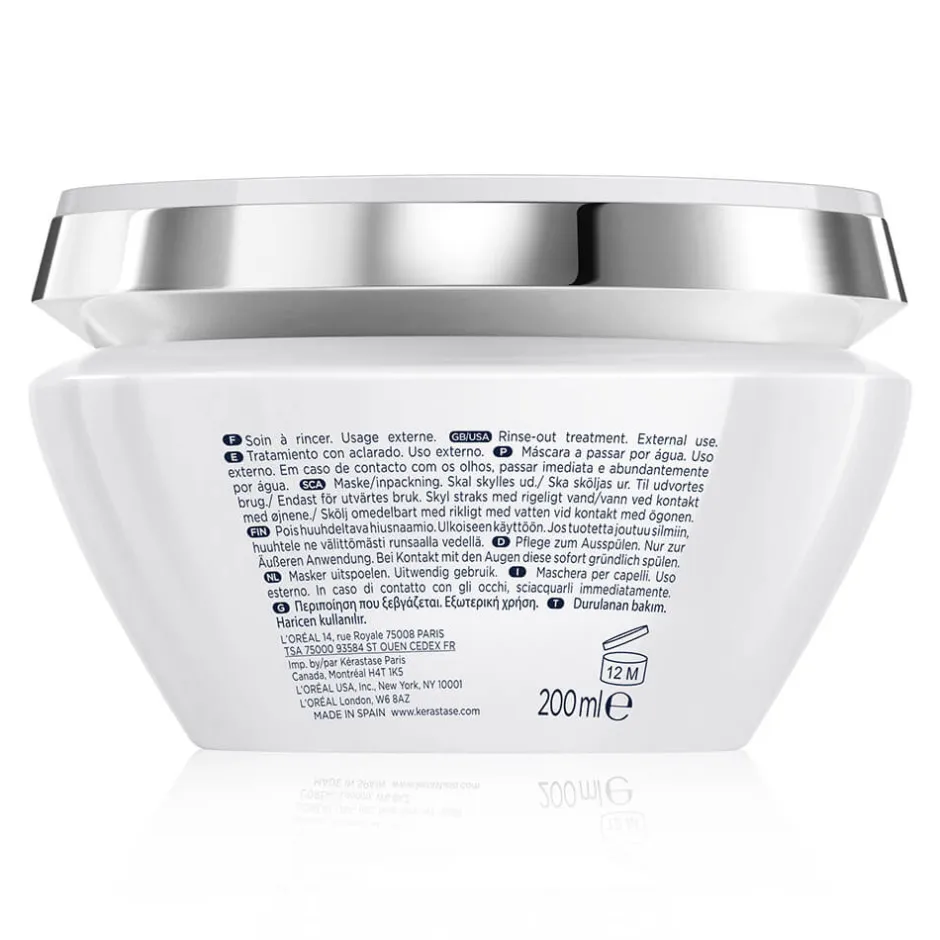 Das KÉRASTASE-Produkt präsentiert sich in einem eleganten, modern gestalteten Behälter, dessen zeitlose Ästhetik sofort ins Auge fällt. Die Form des Flakons ist klar und funktional, mit einem glänzenden Deckel, der die edle Erscheinung unterstreicht. Sorgfältig abgerundete Kanten und ein minimalistisches Schriftbild verleihen der Verpackung eine ansprechende und hochwertige Wirkung. Diese geschmackvolle Gestaltung macht die Maske nicht nur zu einem Pflegeprodukt, sondern auch zu einem stilvollen Accessoire in Ihrem Badezimmer.