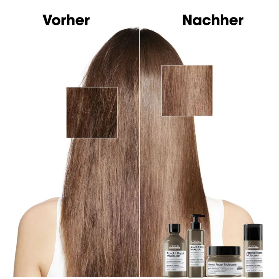 Das L’Oréal Professionnel Absolut Repair Molecular Rinse-Off Serum bietet eine innovative Lösung für stark geschädigtes Haar. Mit einer einzigartigen Formel aus 2% Peptidbondern und 5 Aminosäuren dringt es tief in die molekulare Struktur ein und repariert effektiv zwei Jahre Haarschäden in nur einer Anwendung. Die leichte, serumartige Textur zieht schnell in die Haarfaser ein, ohne zu beschweren, und hinterlässt das Haar gestärkt, elastisch und voller Beweglichkeit. Für ein umfassendes Pflegeerlebnis empfiehlt sich die anschließende Anwendung der Serie Expert Metal DX Maske, die die Reparaturwirkung unterstützt und das Haar zusätzlich pflegt. Auf diese Weise erlangen Sie kräftiges, gesund aussehendes und fließendes Haar zurück.