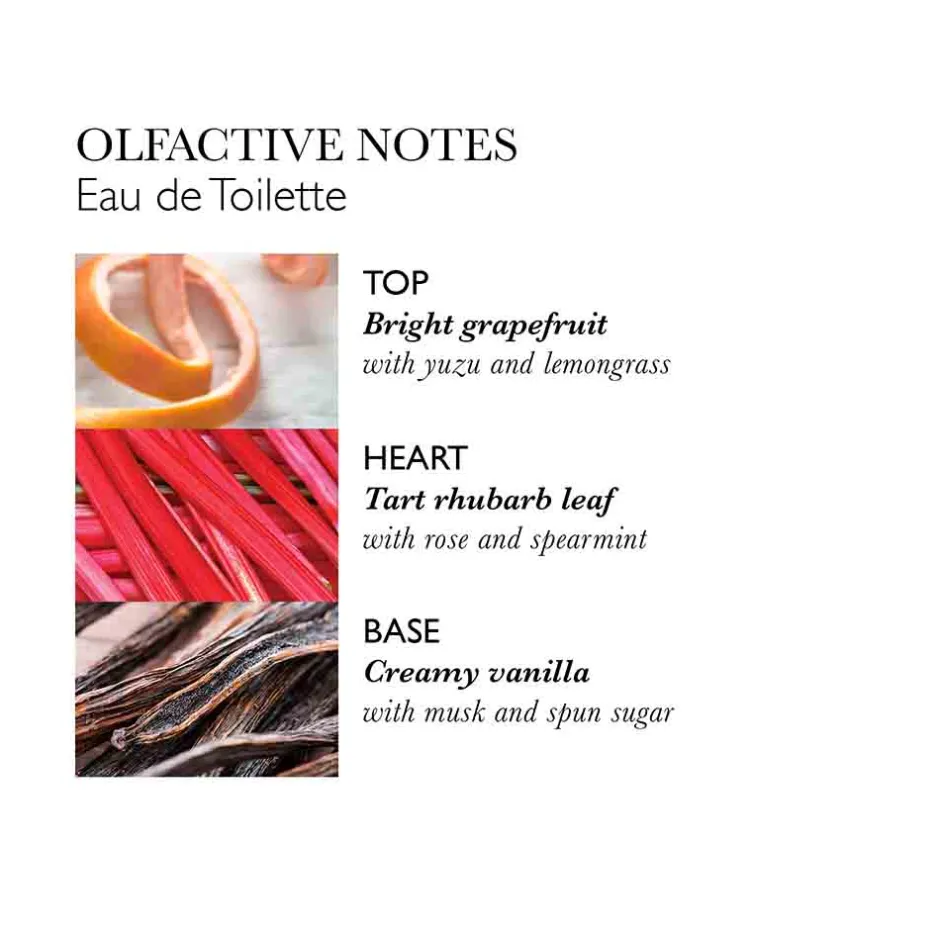 Mit dem Molton Brown Delicious Rhubarb & Rose Eau de Toilette Nat. Spray erwartet Sie ein Duft, der an ein raffiniertes Dessert erinnert. Die lebhaften Kopfnoten von Grapefruit, Yuzu und Zitronengras eröffnen ein frisches, spritziges Dufterlebnis. Im Herzen entfalten sich die Aromen von Rhabarberblatt, Rose und grüner Minze, die für eine blumige und gleichzeitig erfrischende Note sorgen. Abgerundet wird der Duft durch die sanfte Umarmung von Vanille, Moschus und Zuckerwatte in der Basis, die eine wohltuende Wärme verströmen. Dieses Eau de Toilette ist eine Hommage an die blumige Duftfamilie und eignet sich ideal für sonnige Persönlichkeiten, die Geselligkeit schätzen. Die Kreation von Vanessa Prudent ist inspiriert von der Harmonie zwischen Gastronomie und Natur und hat sich zu einem preisgekrönten Klassiker entwickelt.