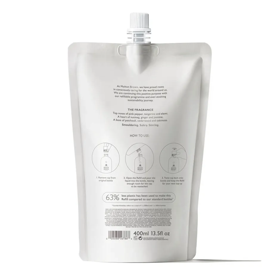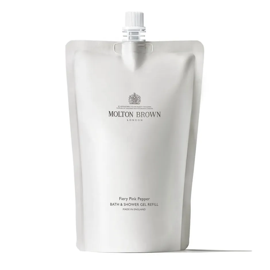 Das Molton Brown Fiery Pink Pepper Bath & Shower Gel Refill verspricht Ihnen ein luxuriöses Dufterlebnis. Die Komposition aus rosa Pfeffer, Muskatnuss und Patchouli entführt Sie in eine Welt voller sinnlicher Aromen. Diese außergewöhnliche Duftmischung sorgt beim Baden oder Duschen für einen Hauch von Extravaganz und verleiht Ihrer Haut einen unvergleichlichen Duft. Die Nachfüllpackung ermöglicht es Ihnen, Ihre wertvolle Glasflasche bequem und ressourcenschonend aufzufüllen. Mit 63 % weniger Kunststoff im Vergleich zu den Standardflaschen setzen Sie ein Zeichen für Nachhaltigkeit, ohne auf Luxus verzichten zu müssen.