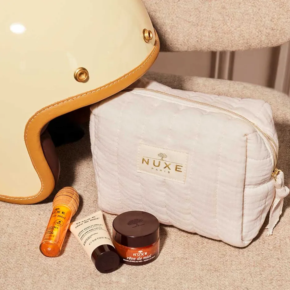 Das NUXE Essentials Reisegrößen Set bietet Ihnen eine luxuriöse Pflegeerfahrung für Ihre Lippen und Hände. Die Rêve de Miel Hand- und Nagelcreme verwöhnt Ihre Haut mit nährenden Inhaltsstoffen und sorgt für geschmeidige Hände. Der Lippenbalsam mit Honig schützt und pflegt Ihre Lippen intensiv, während die Rêve de Miel Lippenpflege für eine zusätzliche Feuchtigkeitszufuhr sorgt. Die perfekt abgestimmte Kombination sorgt für ein unvergleichliches Pflegeerlebnis, das Sie überallhin begleiten kann. Lassen Sie sich von der beruhigenden Kraft des Honigs verwöhnen und spüren Sie den Unterschied.