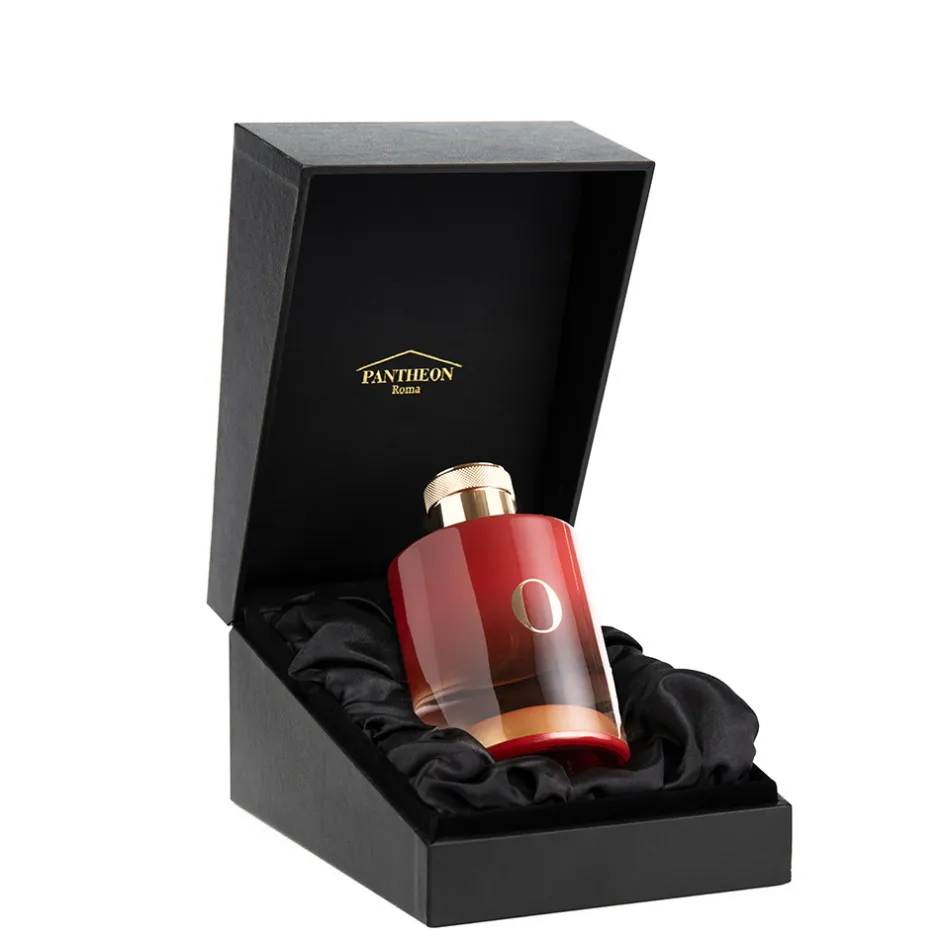 Der Flakon selbst ist ein Kunstwerk der Raffinesse. In einem harmonischen Farbverlauf von tiefem Rot zu klaren, transparenten Tönen spiegelt er die Ewigkeit wider, die der Duft verkörpert. Der goldene Verschluss rundet das elegante Design ab und zieht den Blick wie ein majestätisches Bauwerk an. Die makellose Kreisform des Flakons ist eine Hommage an Vollkommenheit und zeitlose Schönheit, ein Objekt, das sowohl in Ihrer Sammlung als auch in Ihrer Hand seinen Platz findet. Der Pantheon Roma Flakon symbolisiert nicht nur seinen Inhalt, sondern ist selbst ein Meisterwerk der Gestaltung.