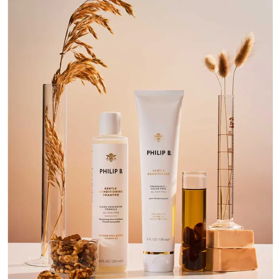 Der Philip B Gentle Conditioner bietet eine außergewöhnliche Pflegeerfahrung, die speziell für empfindliche Haut konzipiert ist. Ohne Duftstoffe bleibt der Conditioner sanft und schonend, während er gleichzeitig kraftvoll wirkt. Angereichert mit hochwertigen Inhaltsstoffen wie Sheabutter und Vitamin B5, sorgt diese Spülung für eine tiefenwirksame Feuchtigkeitspflege. Weizenproteine verbessern die Haarstruktur, sodass Ihr Haar üppig, seidig und glänzend erscheint. Diese Zusammensetzung macht den Philip B Gentle Conditioner zu einem unverzichtbaren Bestandteil Ihrer Haarpflegeroutine, wenn Sie auf der Suche nach effektiver, jedoch sanfter Pflege sind.