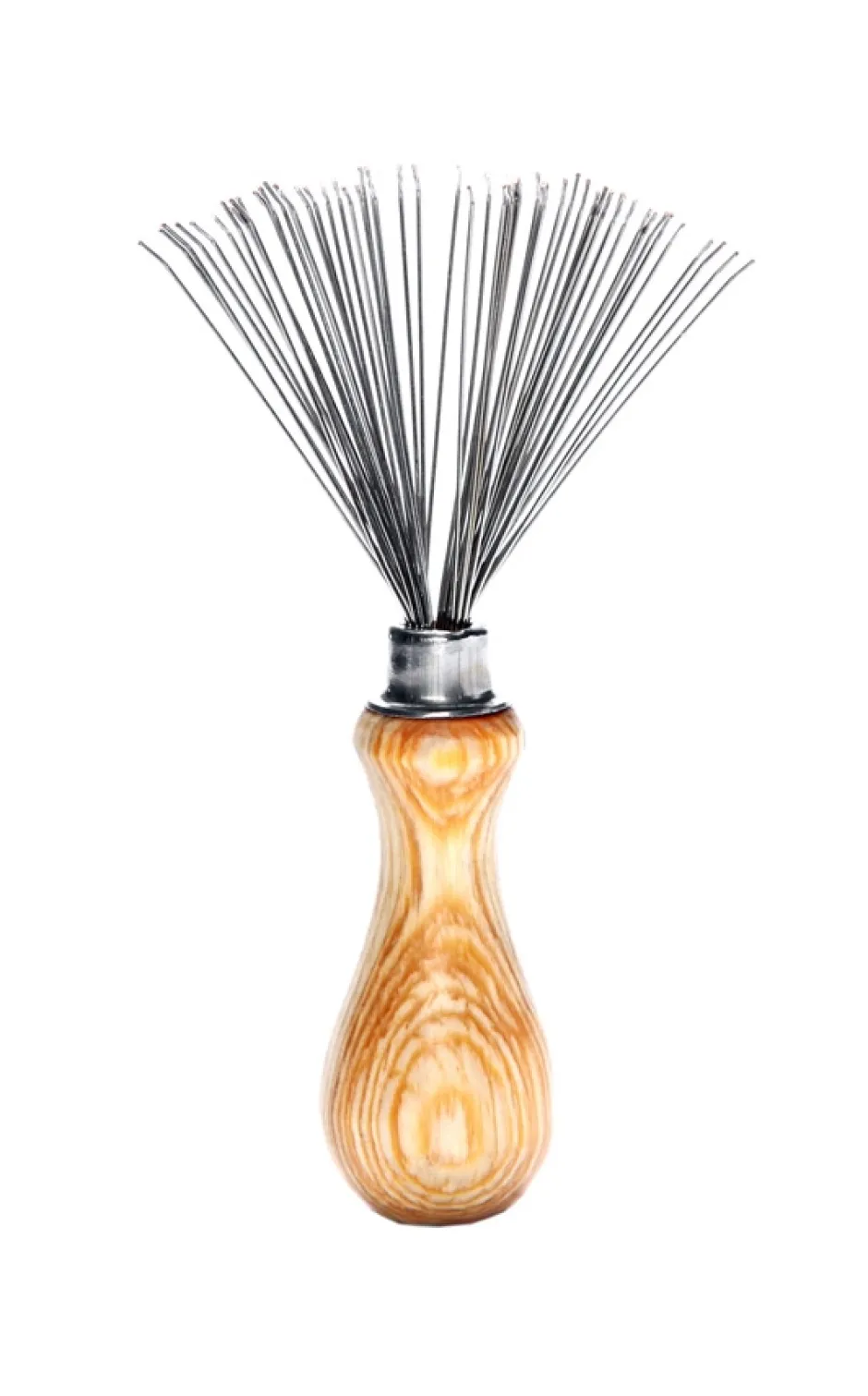 Der Philip B Hairbrush Cleaner besticht durch seine elegante Erscheinung. Der Griff ist aus hochwertigem Holz gefertigt und liegt angenehm in der Hand, während die Metallborsten in einem harmonischen Fächer angeordnet sind. Diese durchdachte Gestaltung verbindet Funktionalität mit Ästhetik, sodass der Cleaner nicht nur nützlich, sondern auch ein stilvolles Accessoire in Ihrem Badezimmer ist. Seine kompakte Form ermöglicht eine einfache Handhabung und macht ihn zu einem praktischen Begleiter für die tägliche Haarpflege.