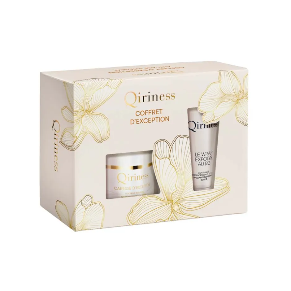 Das QIRINESS Exception Gift Set vereint Pflege und Erneuerung in einem einzigartigen Set. Die CARESSE D’EXCEPTION Creme ist die ideale Lösung für reife, trockene und fahle Haut. Mit einer beeindruckenden Formel, die zu 91 % aus intensiven Pflegestoffen besteht, spendet sie Ihrer Haut sofortige Feuchtigkeit und verleiht ein jugendliches Strahlen. Diese exquisite Creme wirkt gezielt gegen tiefere Fältchen und zeigt innerhalb von sechs Wochen ihre volle Wirkung. Ergänzt wird das Set durch LE WRAP EXFOLYS AU RIZ, ein feines Peeling, das Ihre Haut durch seine biomechanische Wirkung sanft erneuert. Mit einem hohen Anteil von 93 % an natürlichen Inhaltsstoffen befreit es die Poren und hinterlässt Ihre Haut unvergleichlich glatt und strahlend.
