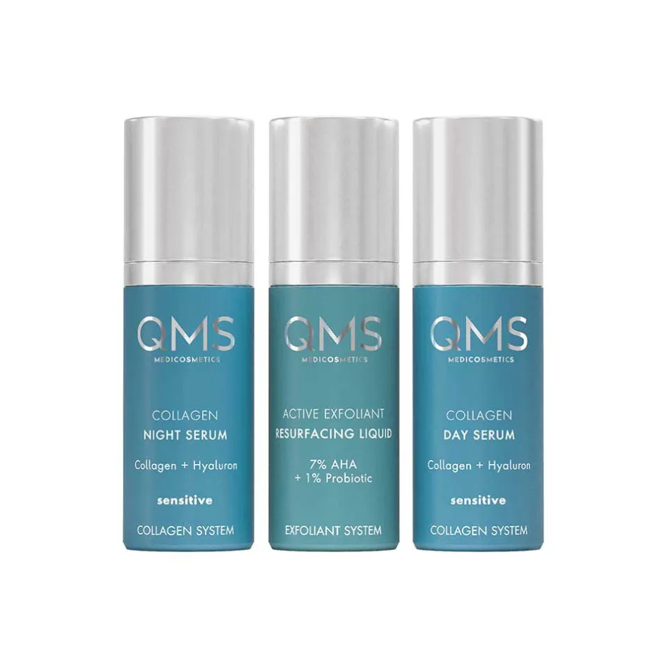 Set bestehend aus: Day Collagen Sensitive Serum, Night Collagen Sensitive Serum und 7% Active Exfoliant Resurfacing Liquid. 3x30ml