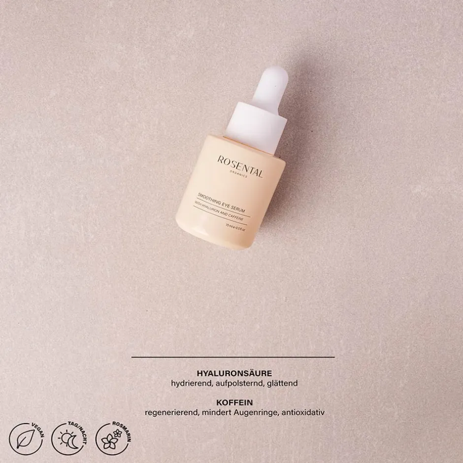 Das Rosental Smoothing Eye Serum ist Ihre Lösung für eine sichtbar glattere und erfrischte Augenpartie. Die einzigartige Kombination aus Hyaluron und Koffein wirkt gezielt auf die empfindliche Haut unter den Augen. Hyaluron spendet intensive Feuchtigkeit und polstert die Haut sanft auf, während Koffein dazu beiträgt, Augenringe zu mindern und Schwellungen zu reduzieren. Diese synergistische Wirkung sorgt dafür, dass Ihre Augenpartie revitalisiert und erfrischt wirkt. Das Serum zieht schnell ein, hinterlässt ein seidiges Gefühl und ist ideal für die tägliche Anwendung. Es ist dermatologisch getestet und für alle Hauttypen geeignet, sodass Sie sich auf eine effektive und verträgliche Pflege freuen können.