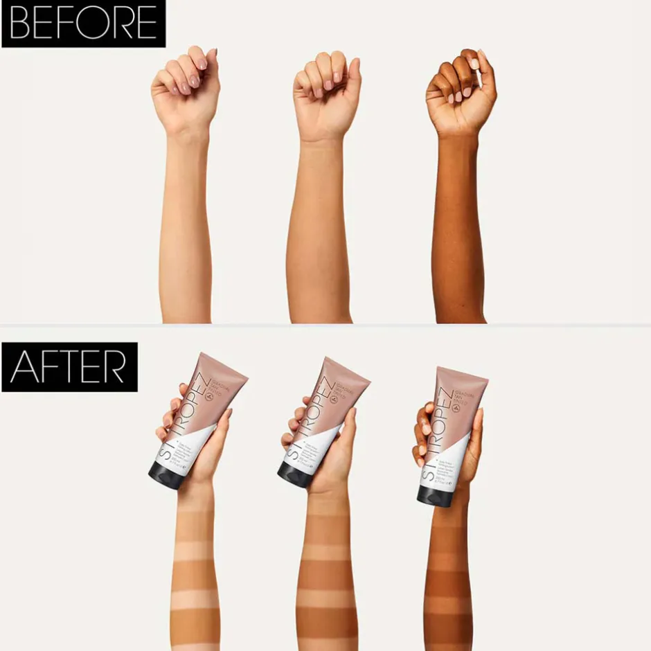 Die St. Tropez Daily Firming Lotion bietet Ihnen eine ausgeklügelte Kombination aus Feuchtigkeitspflege und Bräunung. Die Formel sorgt für eine streifenfreie, goldene Bräune, die sich sanft aufbaut und Ihre Haut gleichzeitig pflegt. Mit hochmolekularer Hyaluronsäure und antioxidativen Ölen aus Blaubeer- und Himbeersamen spendet sie intensive Feuchtigkeit und schützt die Haut vor Umwelteinflüssen. Pflanzliche Meeresalgen unterstützen die Straffung und Glättung der Haut, während die Lotion schnell einzieht und ein samtiges Gefühl hinterlässt. Dank der leichten Tönung können Sie jederzeit den gewünschten Glow erreichen, ideal für die tägliche Anwendung und geeignet für alle Hauttypen. Diese innovative Bodylotion legt besonderen Wert auf Natürlichkeit und Nachhaltigkeit, was durch ihre veganfreundliche und dermatologisch getestete Zusammensetzung unterstrichen wird.