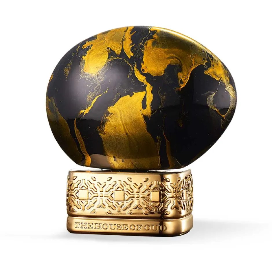 Der Flakon von The House of Oud Eau de Parfum ist ein wahres Meisterwerk der Gestaltung. Seine Form erinnert an ein kunstvoll geschliffenes Objekt, das sowohl robust als auch raffiniert wirkt. Die Oberfläche präsentiert sich in einem tiefen Schwarz, das von dynamischen goldenen Wirbeln durchzogen ist. Diese elegante Kombination aus Farbe und Form verleiht dem Flakon ein luxuriöses und zugleich geheimnisvolles Aussehen. Der Sockel des Flakons ist mit feinen, filigranen Details versehen, die seine erhabene Erscheinung unterstreichen. Ein wahres Schmuckstück, das jeden Raum mit seiner Präsenz bereichert.