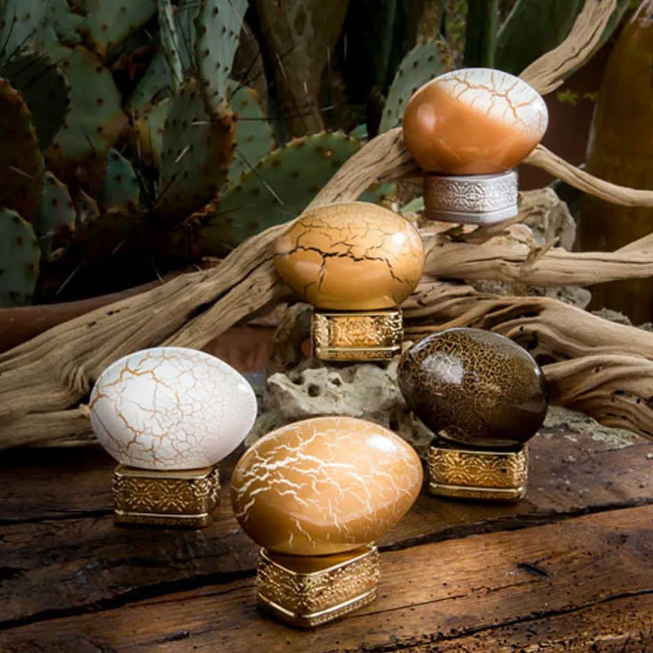 Der kunstvolle Flakon von The House of Oud Eau de Parfum zieht mit seiner außergewöhnlichen Form alle Blicke auf sich. Die ovale Struktur erinnert an kostbare Edelsteine und ist mit einem feinen Netz aus goldenen Adern durchzogen, das die Eleganz und Exklusivität dieses Duftes unterstreicht. Der Sockel, reich verziert und in goldener Pracht gehalten, trägt den Namen des Hauses und verleiht dem Flakon eine majestätische Aura. Diese visuelle Anmutung spiegelt die tiefgründige und inspirierende Duftreise wider und macht ihn zu einem wahren Sammlerstück.