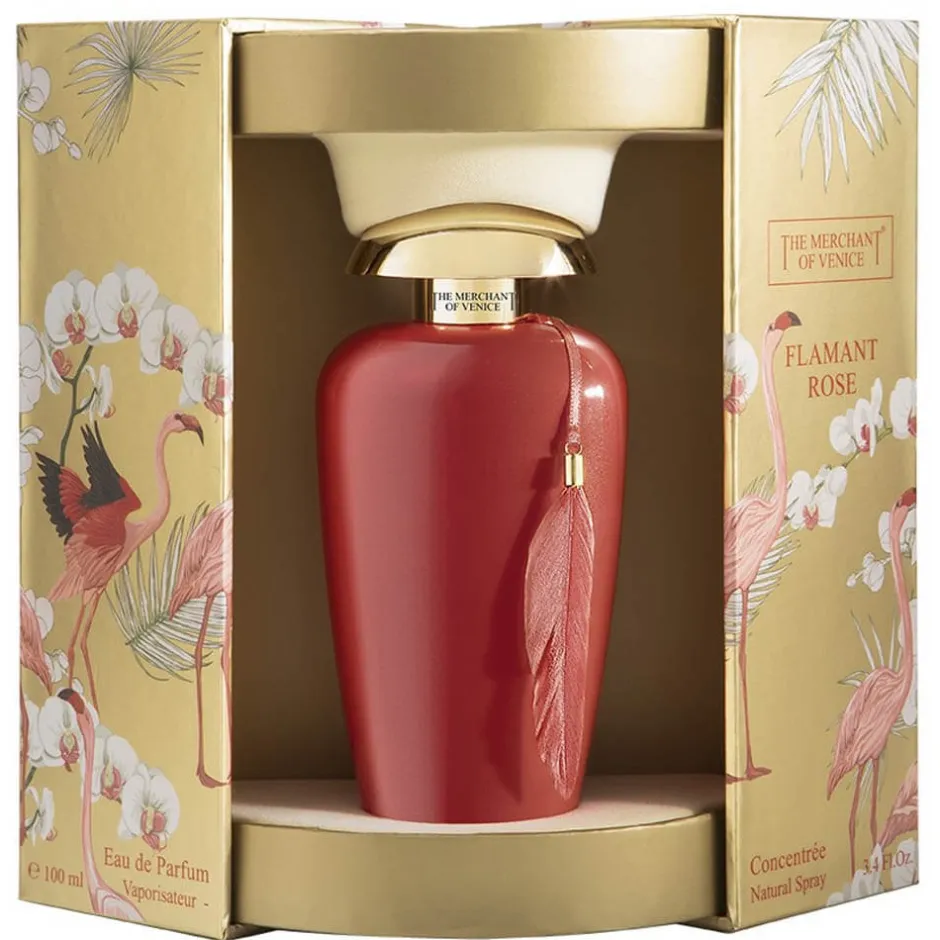 Der Flakon des THE MERCHANT OF VENICE Flamant Rose zieht sofort die Blicke auf sich. In einem leuchtenden Rot gehalten, das an die prächtigen Farben der Flamingos erinnert, überzeugt das Design durch seine geschwungene, harmonische Form. Der goldene Verschluss fügt einen Hauch von Luxus hinzu, während ein zarter, roter Anhänger den Flakon schmückt und den visuellen Anklang an die Lagunenstadt Venedig verstärkt. Die sorgfältige Gestaltung spiegelt die Hingabe zu Detail und Qualität wider, die in jeder Facette dieses außergewöhnlichen Parfums zu spüren ist.