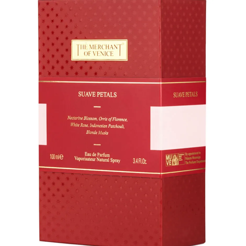 THE MERCHANT OF VENICE Suave Petals Eau de Parfum Nat. Spray verkörpert die symbolische Bedeutung der Pfirsichblüte, die in Asien für die Schönheit einer Frau steht. Die filigrane Zusammensetzung schafft eine verführerische Aura, die anziehend und geheimnisvoll wirkt. Der samtige Touch des Parfums legt sich sanft auf Ihre Haut und entfaltet sinnliche Lagen, die betörend wirken. Die faszinierende Kombination aus weißer Rose und Veilchen aus Florenz wird durch das orientalische Patschuli ergänzt, wodurch eine einmalige Duftkomposition geschaffen wird.
