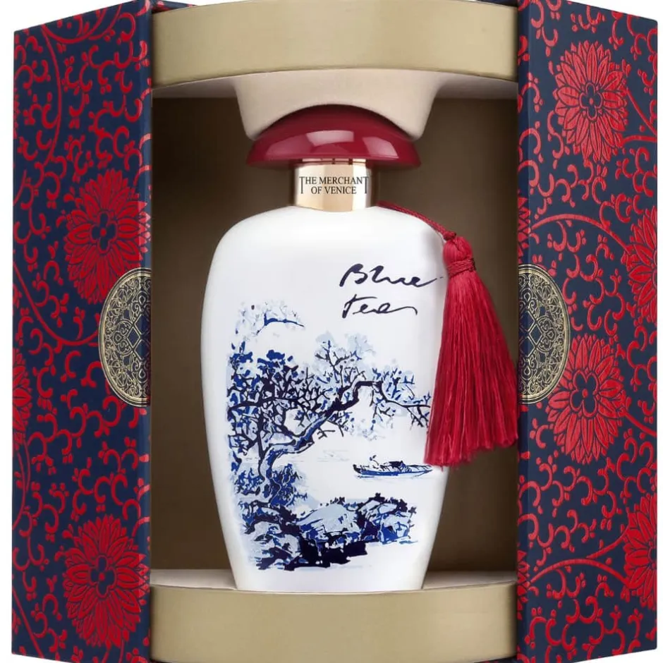 Der Flakon des Blue Tea Eau de Parfum besticht durch seine kunstvolle Gestaltung. Mit einer geschwungenen Form, die Anmut und Eleganz ausstrahlt, zieht er alle Blicke auf sich. Auf der Vorderseite entfaltet sich ein malerisches Motiv, das die Essenz des asiatischen Charmes widerspiegelt. Der Deckel in einem tiefen Rotton verleiht dem Design eine weitere Ebene der Raffinesse. Ein rotes Quasten-Detail rundet das Erscheinungsbild stilvoll ab und macht diesen Flakon zu einem wahren Kunstwerk in Ihrer Sammlung.