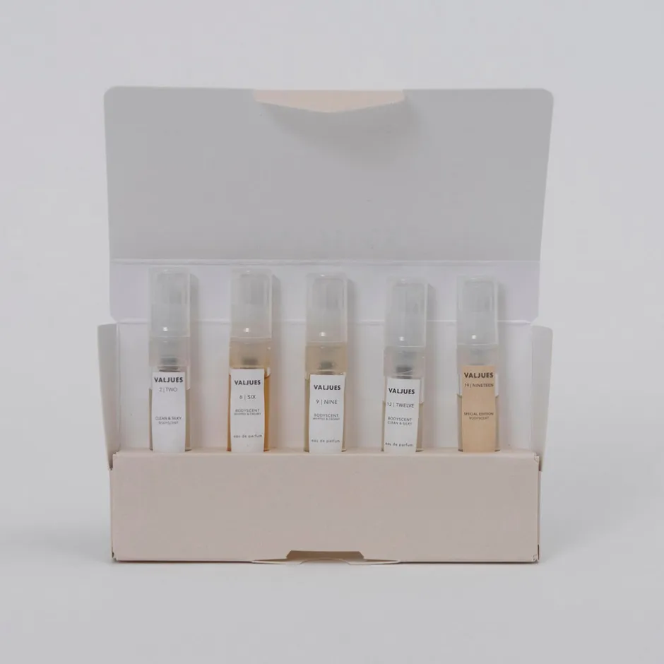 Das Set besticht durch seine durchdachte Präsentation. Die Flakons sind kompakt und minimalistisch gestaltet, was ihnen eine elegante Schlichtheit verleiht. Jeder Flakon spiegelt das puristische Design der Marke wider und vermittelt einen Eindruck von Klarheit und Modernität. Das dezente Etikett hebt die einzelnen Duftnummern hervor und verleiht jedem Fläschchen eine individuelle Note. Die neutral gehaltene Verpackung umhüllt die Düfte in einem zeitlosen Design, das die Wertigkeit der darin enthaltenen Essenzen unterstreicht und sich perfekt als Geschenk eignet.