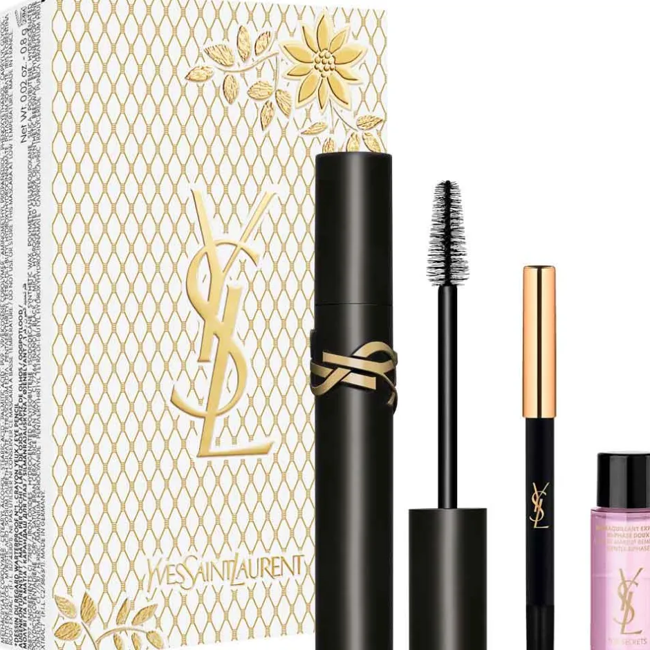 Das Yves Saint Laurent Lash Clash Mascara Set präsentiert sich in einer luxuriösen Hülle, die durch ihr goldenes Spitzendesign besticht. Der elegante, matte Flakon der Mascara liegt angenehm in der Hand und verspricht schon beim Anblick ein exklusives Erlebnis. Der schlichte, schwarze Eyeliner ergänzt das Set perfekt, während der Mini Makeup-Entferner in einem charmanten, kompakten Fläschchen daherkommt, das durch seine sanfte Farbgebung überzeugt. Jedes Detail ist durchdacht und harmoniert perfekt miteinander, sodass dieses Set nicht nur funktional, sondern auch ein optisches Highlight ist. Ein Geschenk, das in jeder Hinsicht beeindruckt.